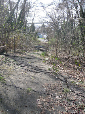 | Disused road all broken up and taken over by trees |